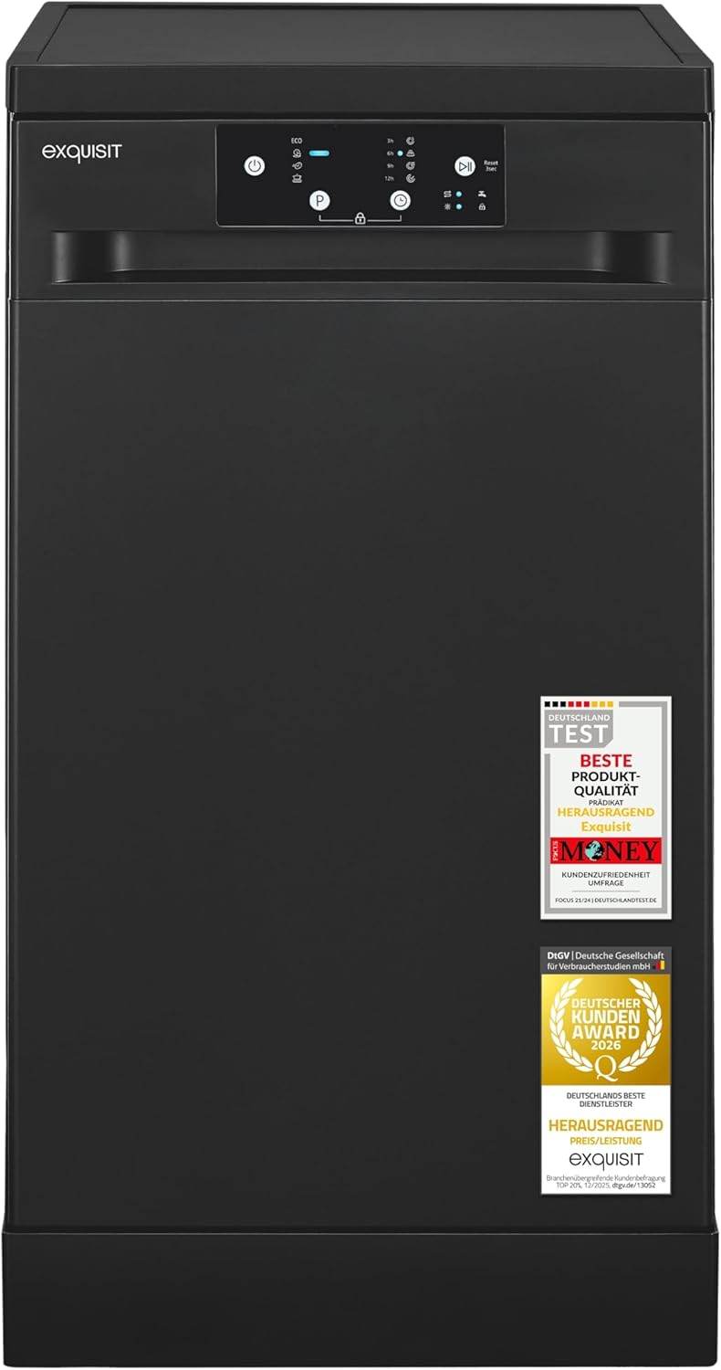 Exquisit Geschirrspüler GSP9109-450D schwarz 9 Maßgedecke 4 Programme Eco 10 L Startzeitvorwahl LED-Anzeige Aquastop