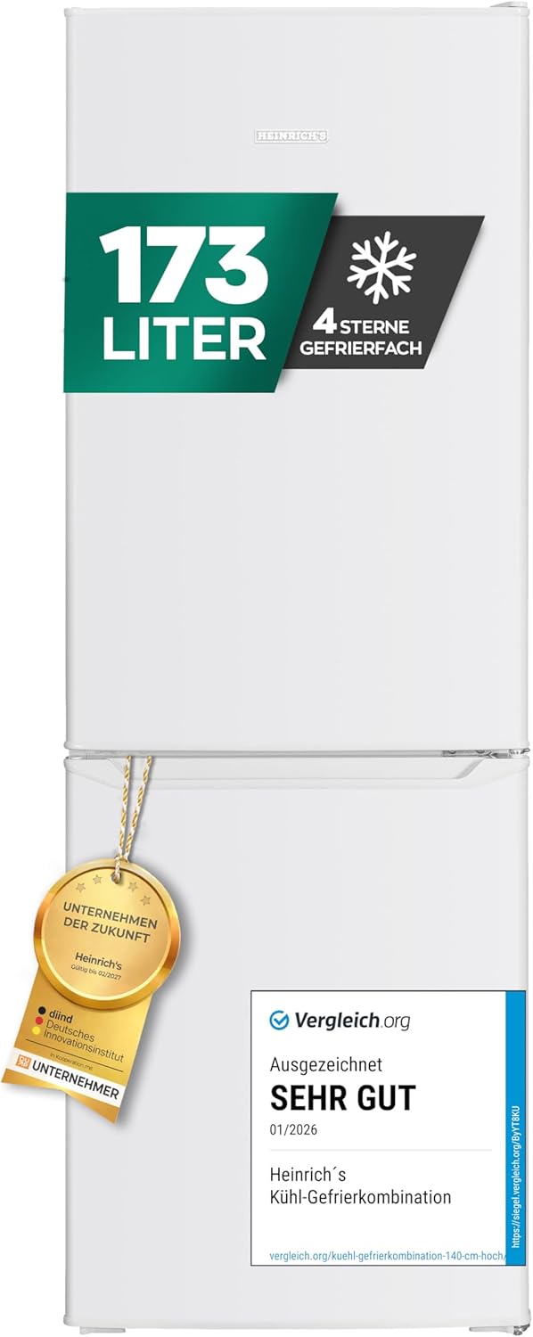 Heinrich's Kühlgefrierkombination 173L Gesamtvolumen, 121L Kühlvolumen, 52L Gefriervolumen, LED Beleuchtung,Türanschlag wechselbar, leise 40dB, große Tiefkühlboxen, 7Temperaturstufen,(weiß)