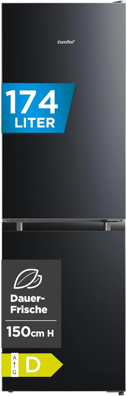 Comfee RCB169DK3 Kühlschrank mit Gefrierfach 150cm Höhe/Kühl-/Gefrierkombination/Low Frost/175L/leise Kühlgefrierkombi 38dB/Einstellbare Kühlschranktemperatur/LED-Licht/156 kWh/Jahr/Schwarz