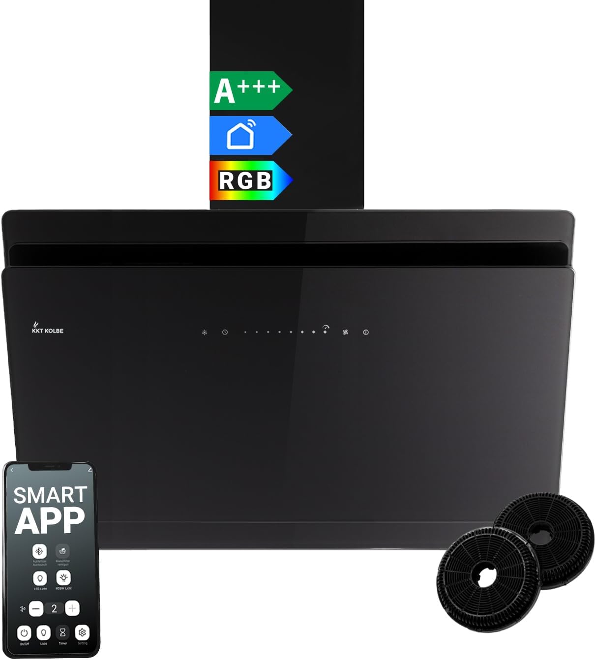 KKT KOLBE A+++ Dunstabzugshaube 90 cm 782 cbm/h Umluft Abluft Kopffrei Wandhaube Glas Schwarz Nachlaufautomatik Smart WiFi App WLAN SensorTouch RGBW LED-Beleuchtung SOLO9005SM