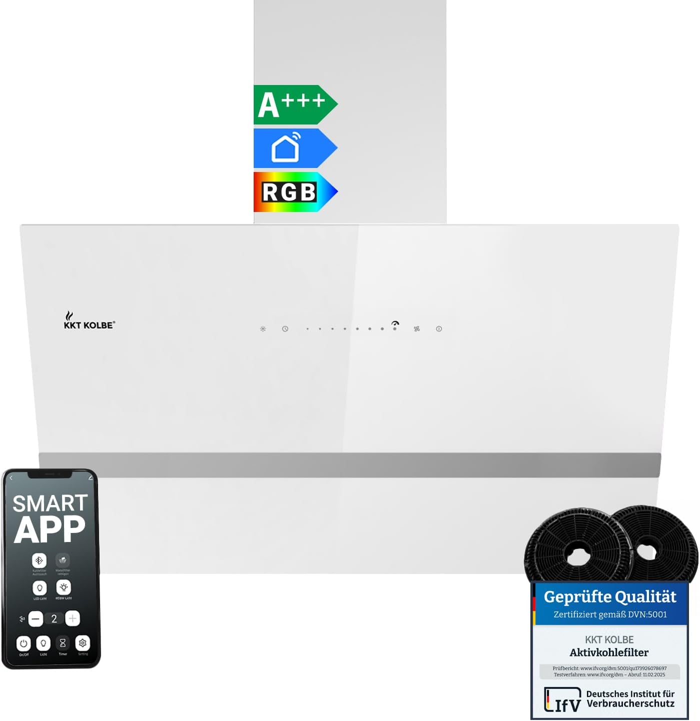 KKT KOLBE Dunstabzugshaube 80 cm 782 cbm/h Umluft Abluft Kopffrei Wandhaube Weiß Glas Smart WiFi App WLAN RGBW-LED-Beleuchtung EASY8005WM